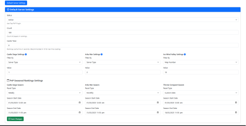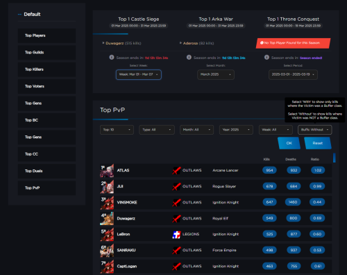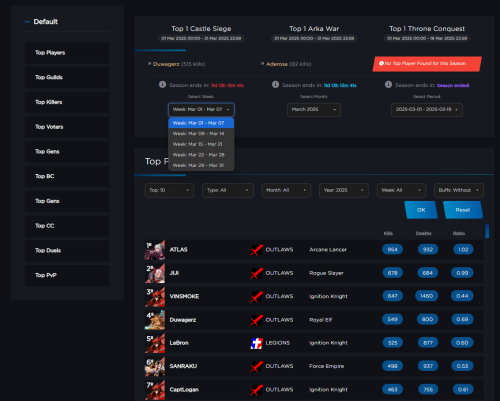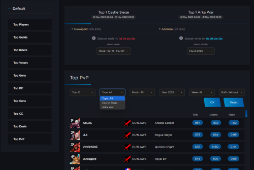 - Dynamic filters to switch between Castle Siege, Arka War, and Throne Conquest.